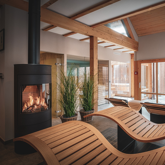 Für Entspannungssuchende bietet das Romantik Hotel Bären einen Wellnessbereich - eine Oase der Ruhe, die mit einer Sauna, einem Dampfbad und einem Ruhebereich mit Kaminofen VIVA 120 L GAS ausgestattet ist. «Unsere Hotelgäste schätzen diesen gemütlichen Rückzugsort», so Herr Beduhn.