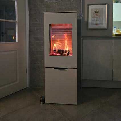 Holz-Kaminofen NEXO 120 in der Farbe Sand mit Stahltür und Seitenfenster sowie Seitenbänke vor brauner Wand