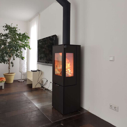 Holz-Kaminofen NEXO 120 in Schwarz mit Vollglas-Feuerraumtür und zwei Seitenfenstern und Eichenholz Türgriff Schwarz